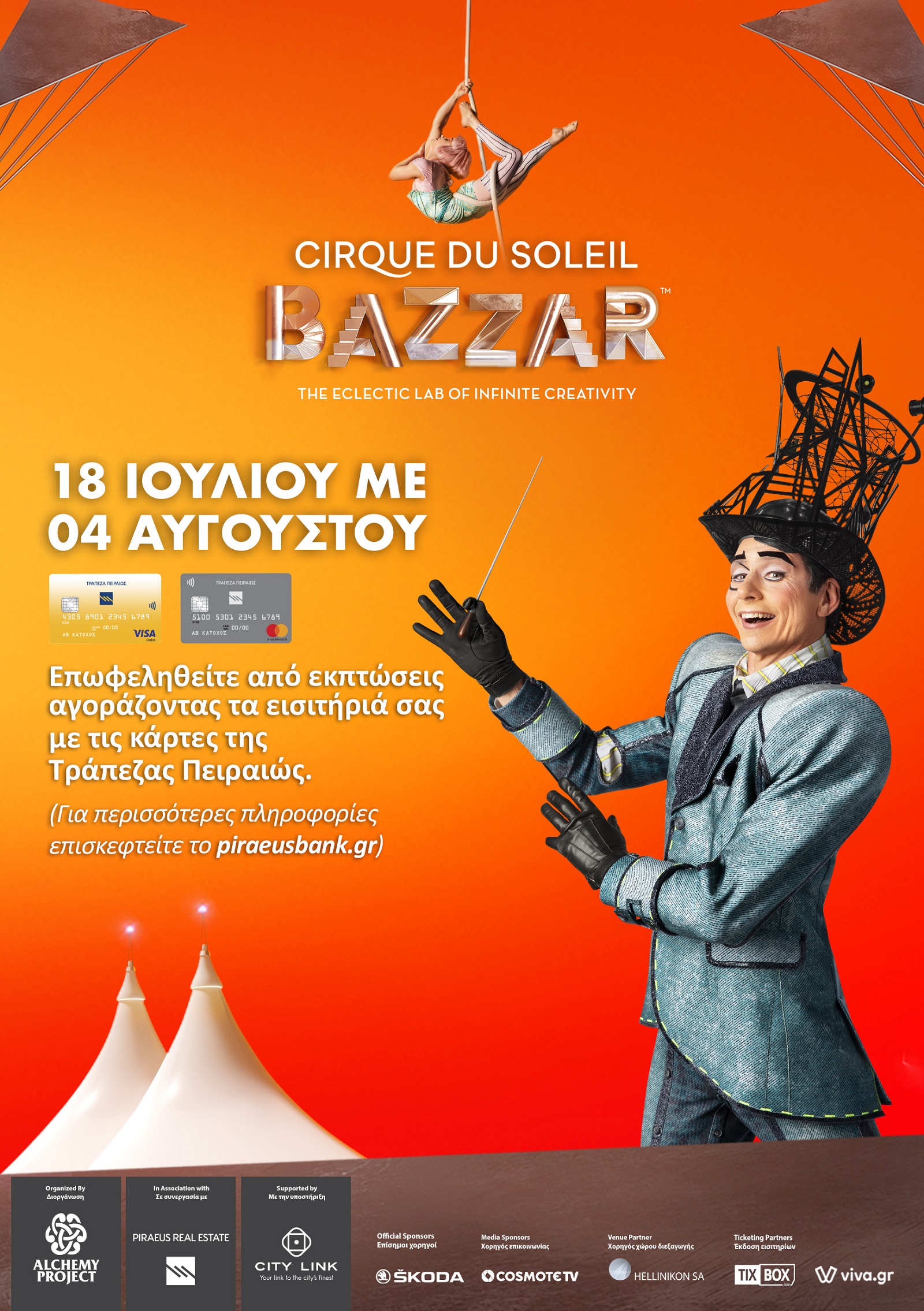 Το BAZZAR του Cirque du Soleil θα παρουσιαστεί κάτω από την Big Top, στην Αθήνα, από τις 18 Ιουλίου μέχρι τις 4 Αυγούστου, 2019. Η προπώληση εισιτηρίων θα είναι διαθέσιμη από τις 19 Ιουνίου 2019 στο Viva.gr.