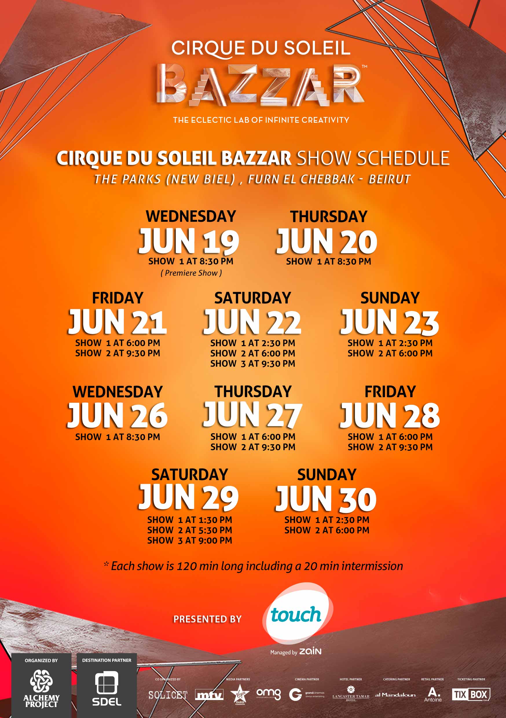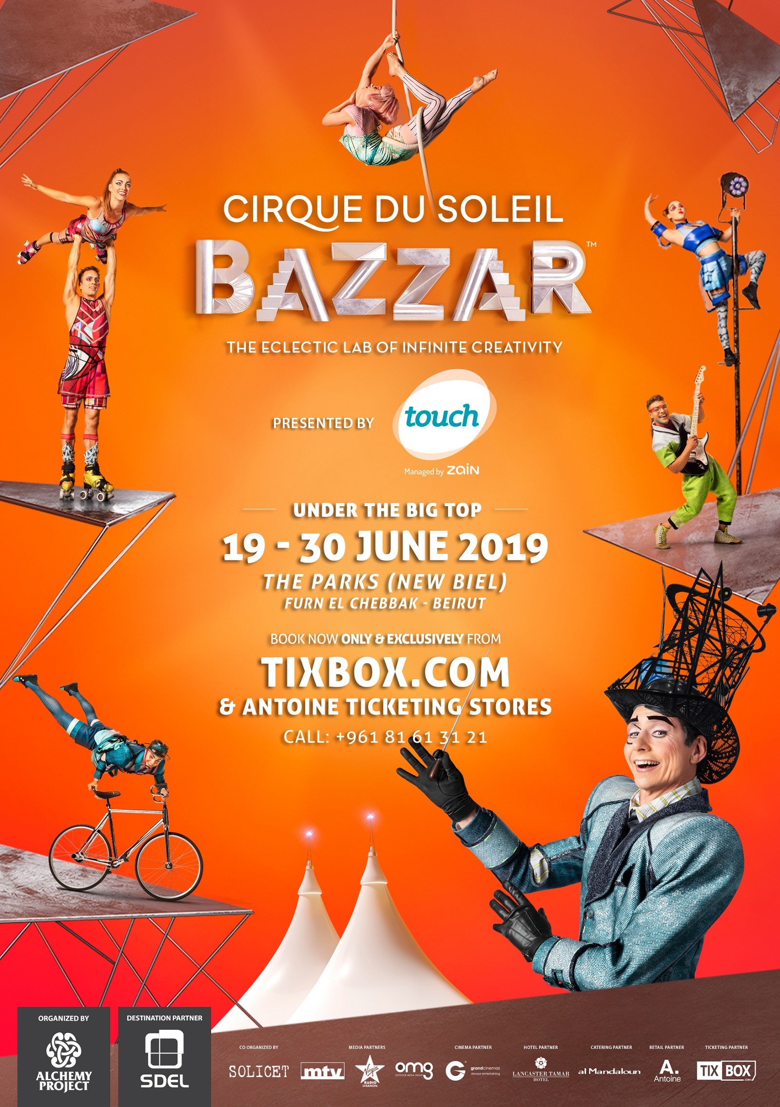 Alchemy Project Entertainment is delighted to bring Cirque du Soleil iconic Big Top to Beirut for the first time ever under the Big Top with its newest production BAZZAR, in association with Touch hosted by THE PARKS New Biel - Furn el Chebbak, supported by MTV and Virgin Radio, coorganized by Solicet. A breath-taking, colourful homage to Cirque du Soleil legacy, BAZZAR will premiere on 19th of June 2019 and will continue its performances until June 30th, 2019 under the Big Top, at THE PARKS (New BIEL) - Furn el Chebbak, Beirut - Lebanon.